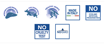 Sirovi protein 30% - Sirova ulja i masti 20% - Sirova vlakna 2,0%, Sirova pepela 7,50%, Kalcij 1,80%, Fosfor 1,45%, Omega 6 esencijalne masne kiseline 3,75% - Omega 3 esencijalne masnoće kiseline 1,10%.